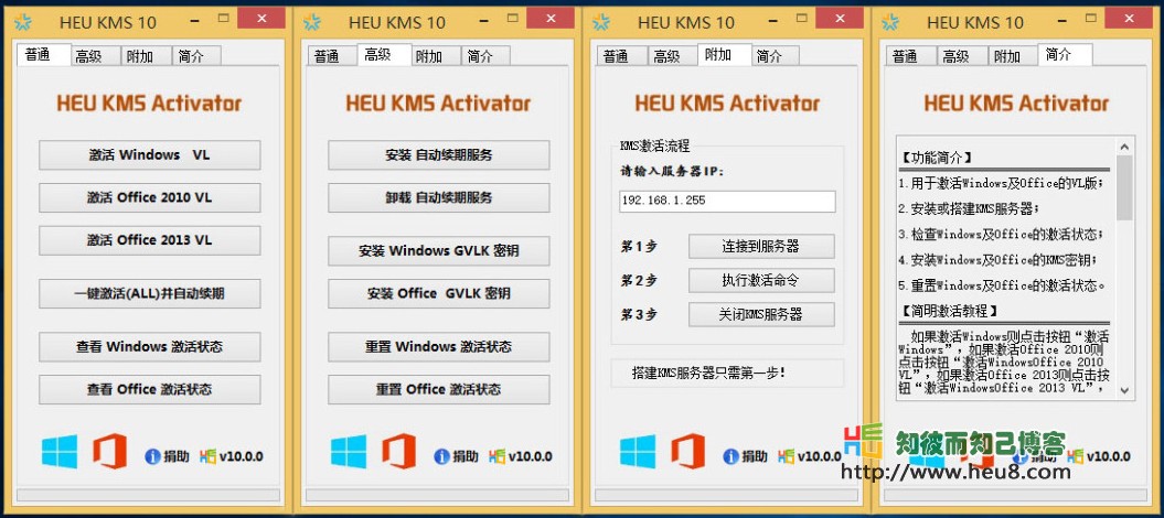 HEU KMS Activator是一款無(wú)需聯(lián)網(wǎng)即可激活Windows 10、Windows 8.1、Windows 8、Windows 7(企業(yè)版/專業(yè)版)、Office 2013 (VL版)、Office 2010(VL版)的工具。其為單一可執(zhí)行的綠色工具,使用完畢后對(duì)系統(tǒng)無(wú)任何殘留,可以直接刪除。此工具為知彼而知己原創(chuàng)工具,根據(jù)網(wǎng)友的