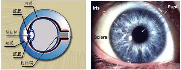 虹膜是眼睛的一個(gè)組成部分,位于人眼表面黑色瞳孔和白色鞏膜之間的環(huán)狀區(qū)域(見(jiàn)圖1(b))。圖1 (a)是眼睛的解剖圖,從圖中我們可以看出,虹膜是眼睛的一個(gè)內(nèi)部器官;然而,位于虹膜之前的角膜是透明的,因此虹膜又是外部可見(jiàn)的。